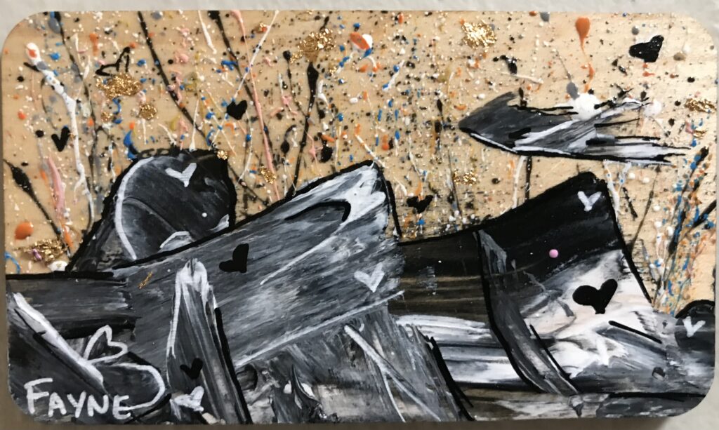 Quatre mois s’écoulent. C’est le début décembre. Je regarde une de tes vidéos et j’allume! Cette carte est pour toi! Je pense que tu seras la deuxième artiste peintre avec qui je vais collaborer. Oui, je le sens et ça vibre!! Mais là…. On ne se connait pas pentoute!!!